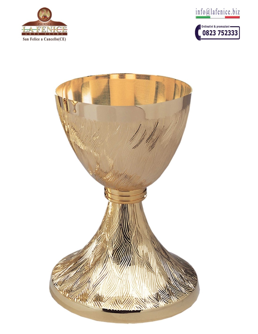 Chalice with all-round depiction of acanthus leaves. Hand sorted. Made entirely of brass and with a golden finish. Total height 16cm, cup diameter 10cm. Supplied with the relevant paten, already included in the proposed price.