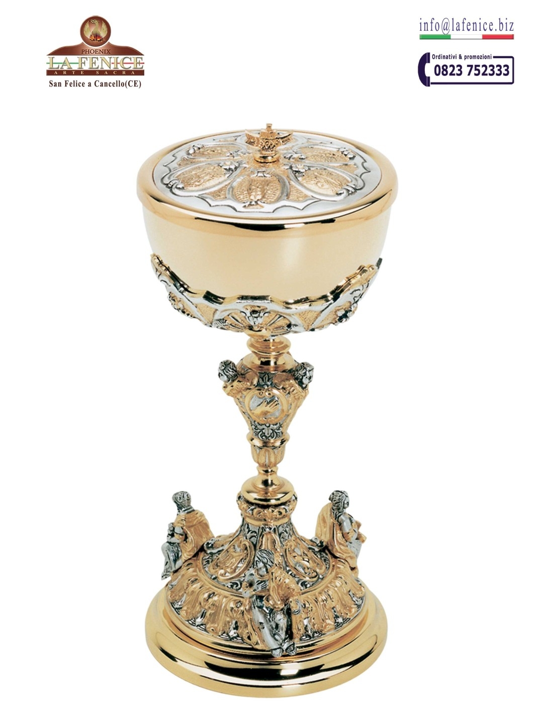 Pyx with depiction of the three theological virtues, faith, hope and charity. Hand chiselled. Made of brass and with a two-tone gold and silver finish. Total height 30cm, cup diameter 13cm.