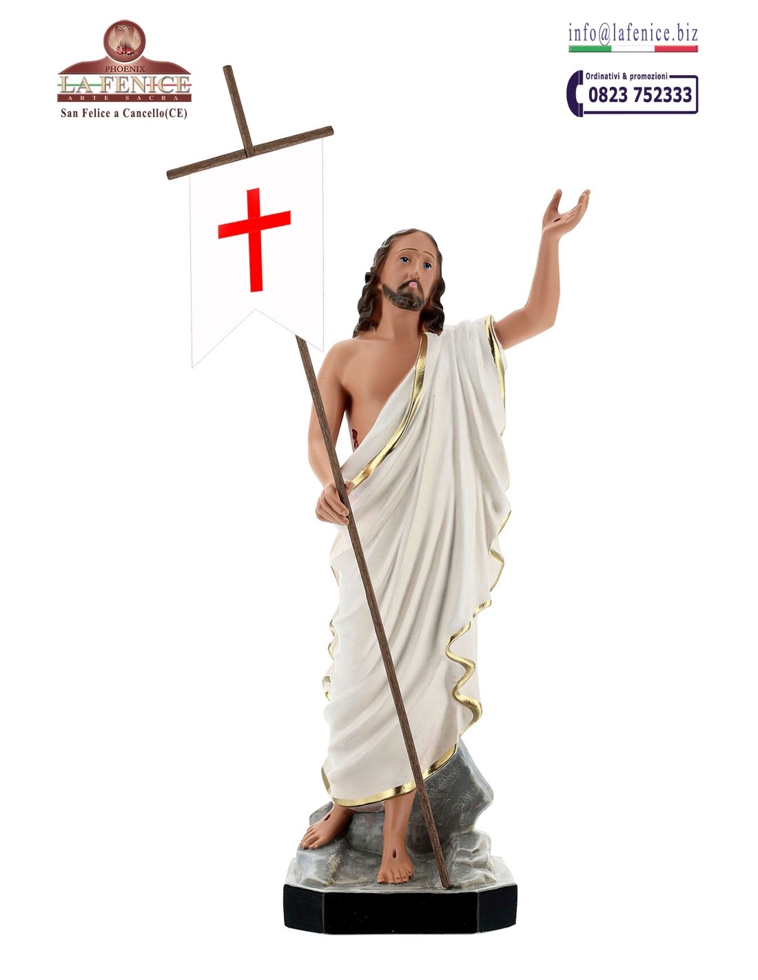 Statue depicting the Risen Jesus measuring 40 cm. Made of resin. Painted and finished by hand.