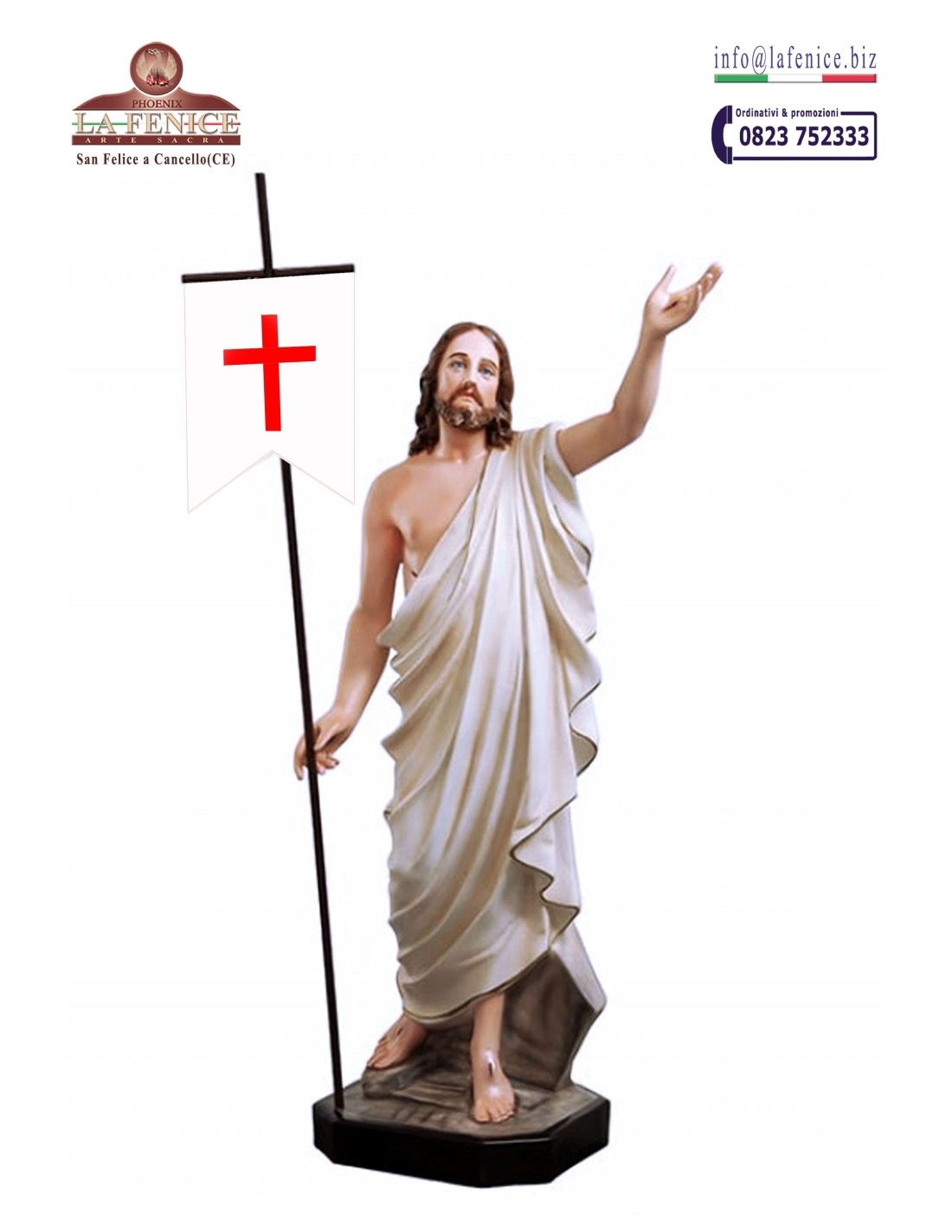 Statue depicting the Risen Jesus measuring 110 cm. Made of fiberglass and with GLASS EYES. Hand painted and finished.