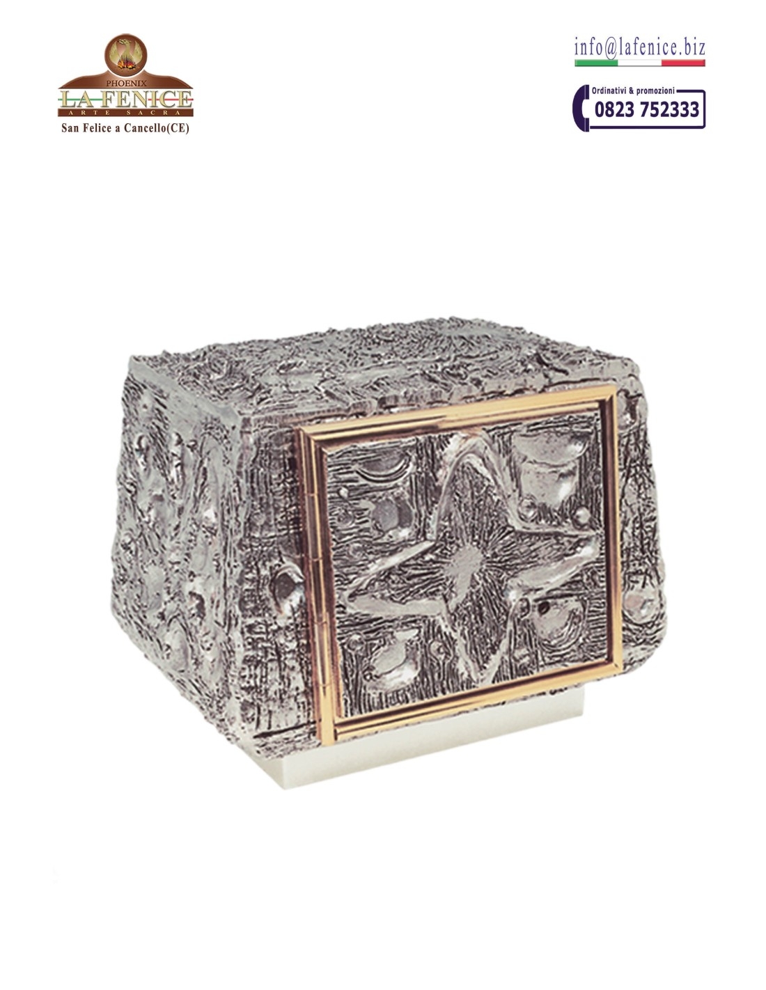 Tabernáculo de mesa con rico bajorrelieve bicolor que representa la "Cruz Griega". Realizado con puerta en bajorrelieve acabada en bicolor oro/plata. Caja de latón. Base de soporte fabricada en latón. Con cierre de seguridad.