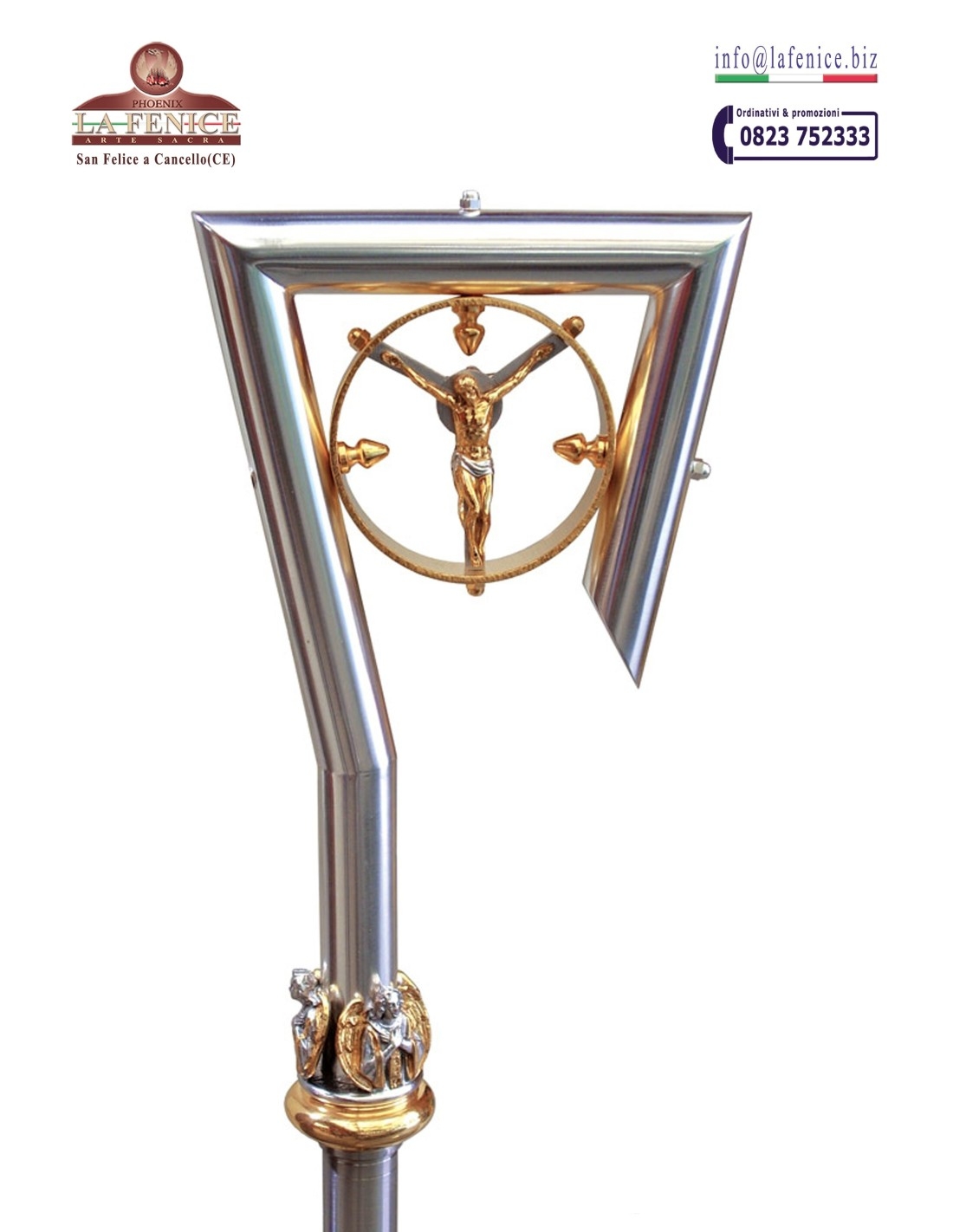 Bacùlo episcopal con “Crucifijo”. Realizado en latón bicolor dorado/plateado con nudo "Ángeles" en bronce plateado. Alto 150cm.