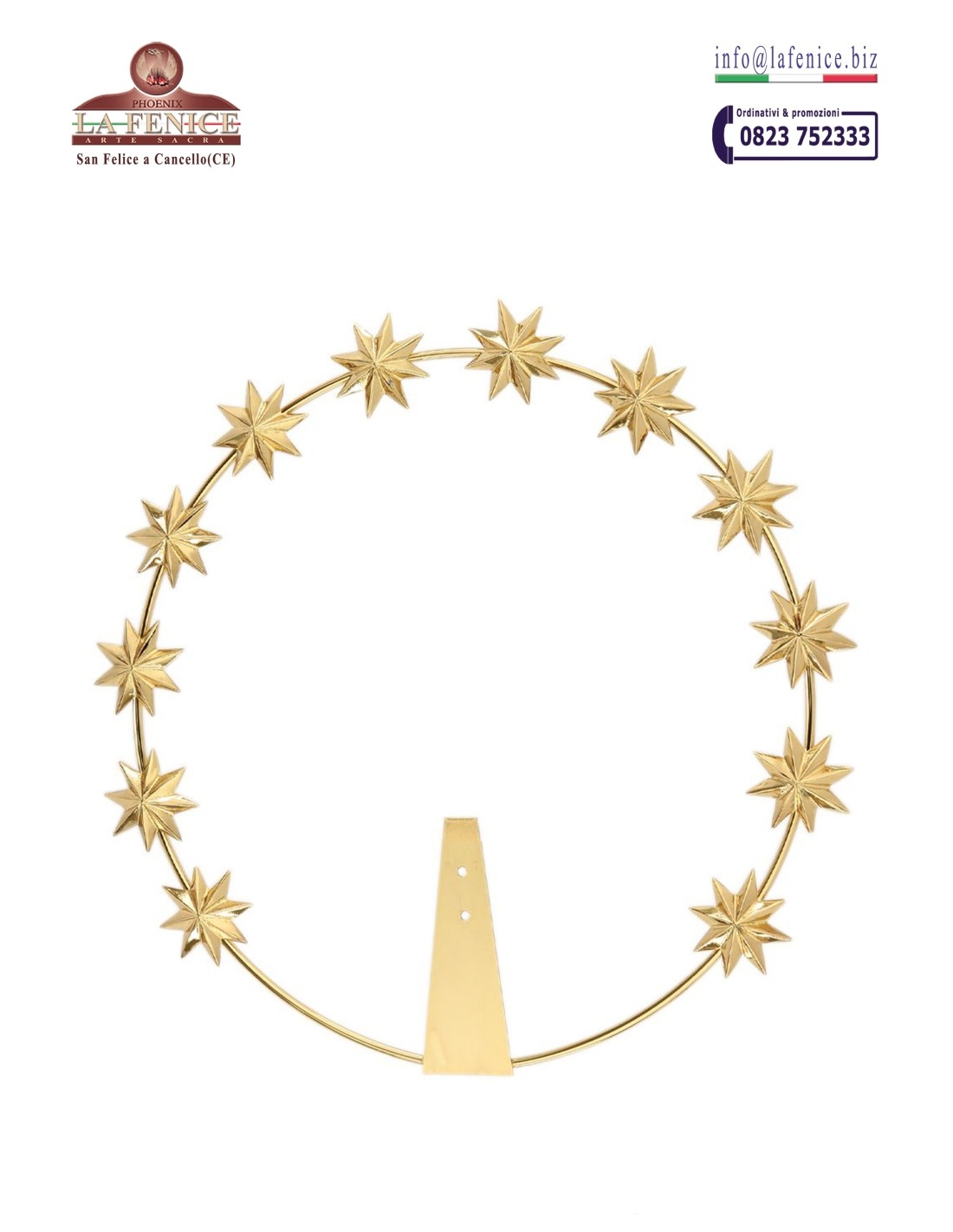 Stelario para estatua. Realizada en latón dorado y con 12 estrellas proporcionales a la altura de la estatua. Halo con agujeros de fijación.