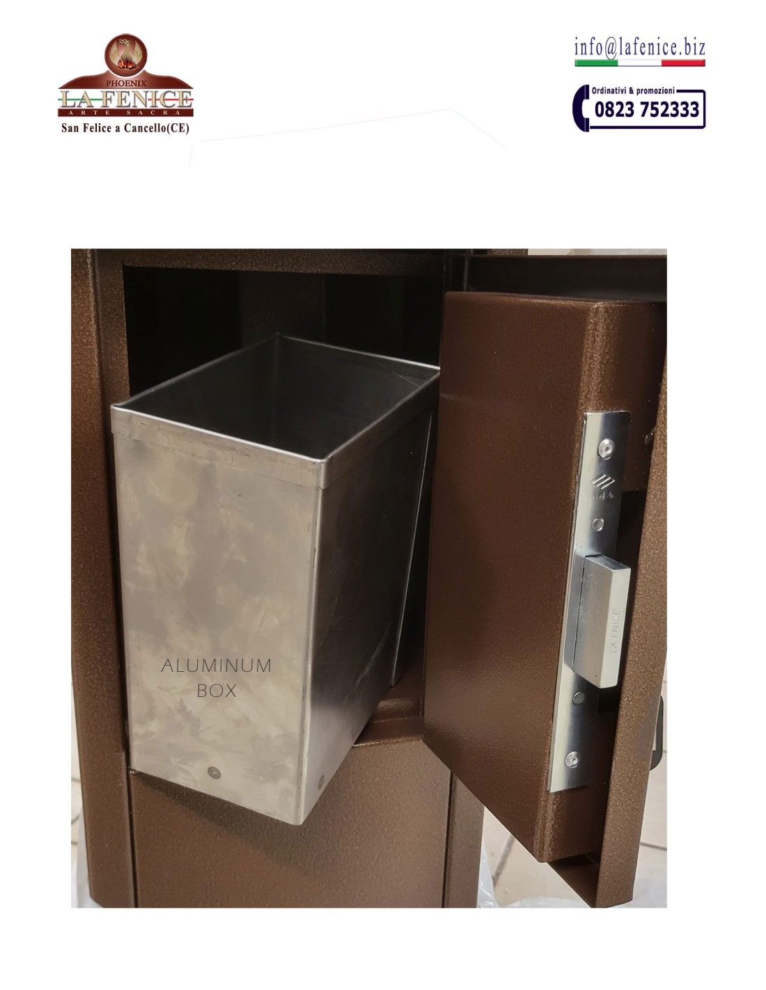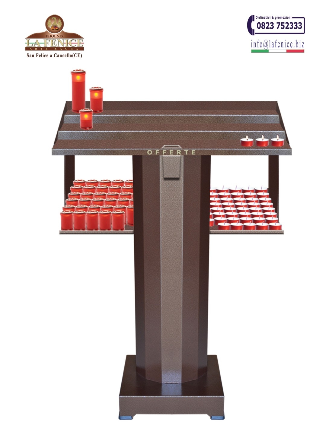 Candelabros votivos para velas de todos los tamaños. Con BLOQUEO DE SEGURIDAD y caja interna para recuperación separada de ofertas. Con VARILLAS ANTI-RAYAS y ANTIDESLIZANTES en el suelo. Con BARRAS ESTABILIZADORAS antibalanceo. Pintura epoxi no tóxica. Apto para cualquier tipo de oferta. Según normativa CE.