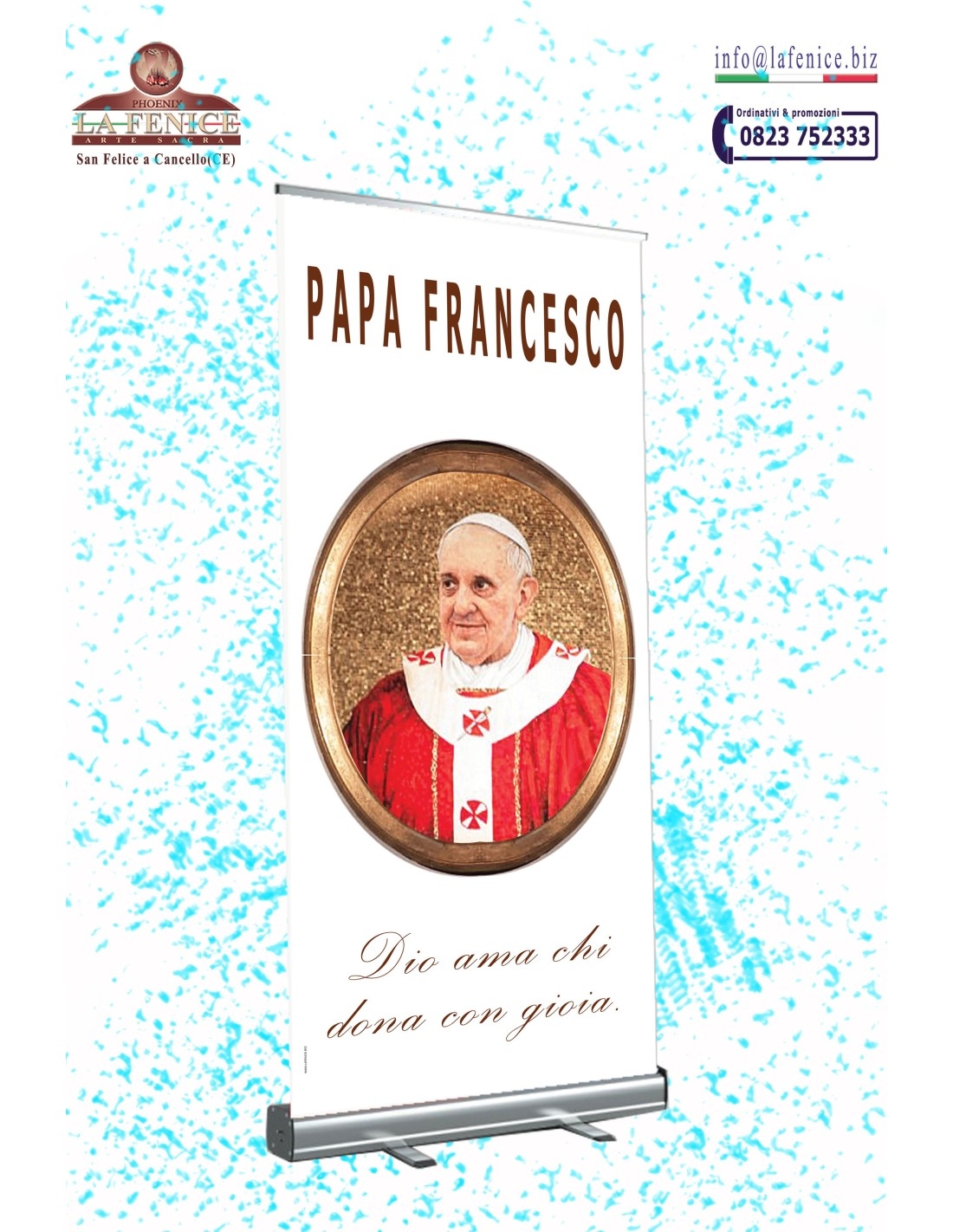 Rollup estensibile bianco con immagine di Papa Francesco e massima.