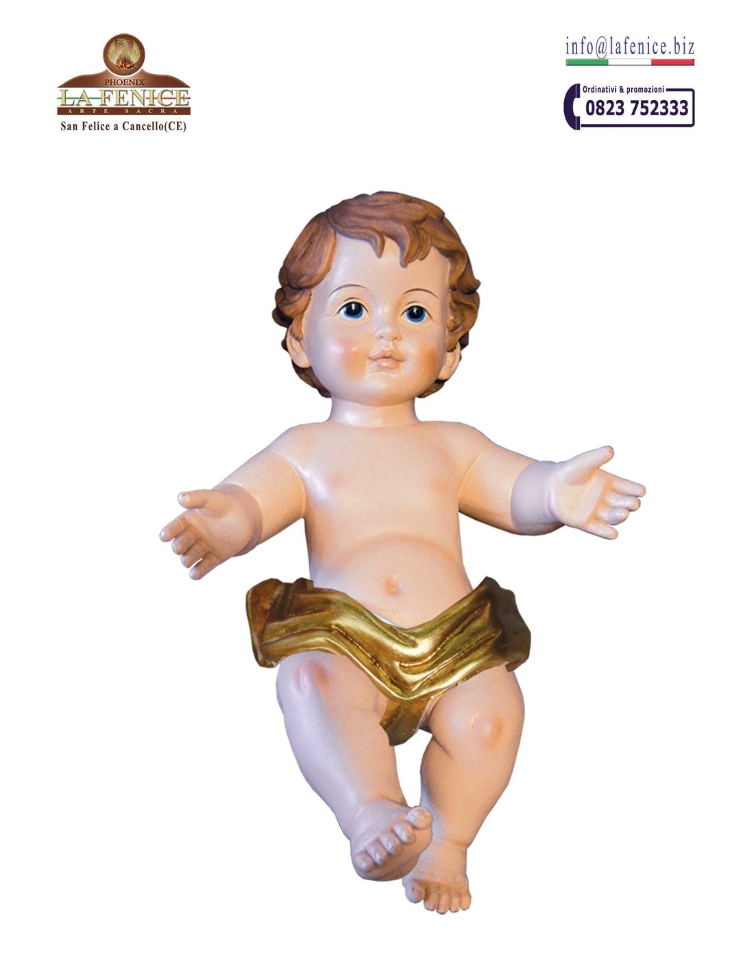 Gesù Bambino con panno dorato. Realizzato in resina dipinta e rifinita a mano. Confezionato in scatola di cartone con rinforzi in polistirolo.