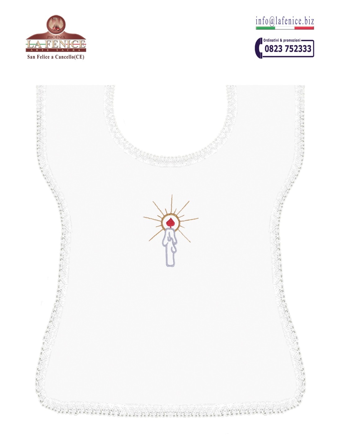 Camicina battesimale ricamata con ricamo candela. Confezionata con merlettino al bordo di colore bianco. Realizzata con ulteriore taglio verticale nel retro che permette di indossare la camicina in modo più agevole. Realizzata a doppia falda fronte e retro. Il ricamo è presente solo sul lato anteriore.