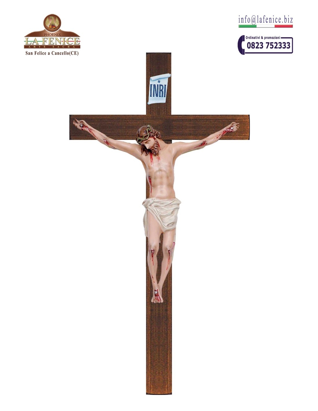 Crocifisso classico. Realizzato in vetroresina. Croce in legno da cm.180 e corpo da cm.80. Interamente dipinto e rifinito a mano.